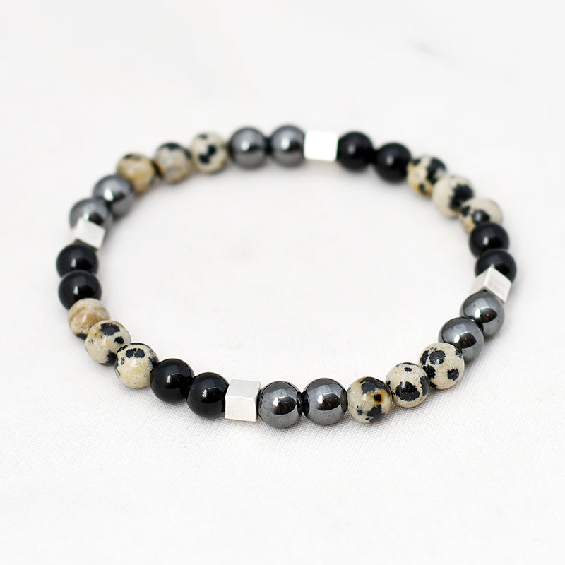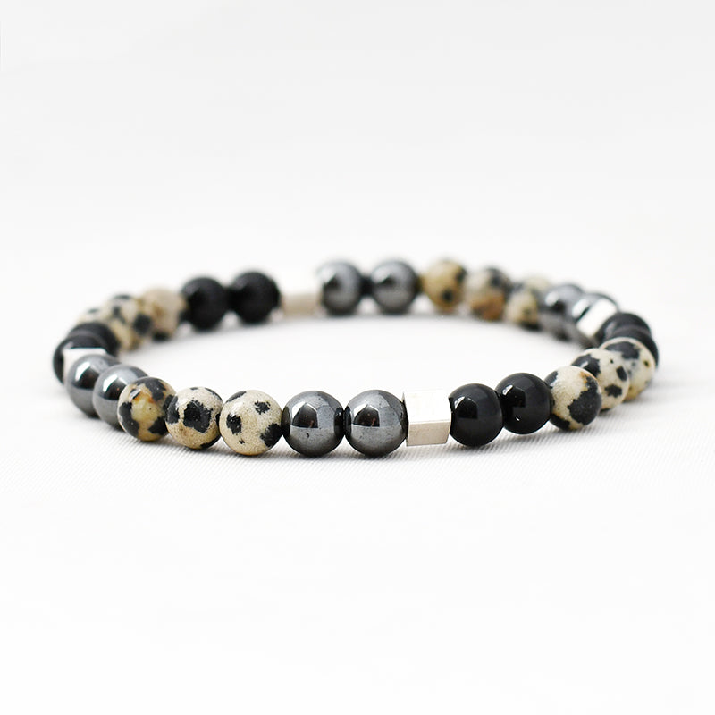 • Een combinatie met onyx, hematiet en dalmatiër jaspis of edelsteen naar eigen keuze (zoals lapis lazuli, sodaliet, kiwi jaspis, tijgeroog, lava, grijze lace agaat etc.).