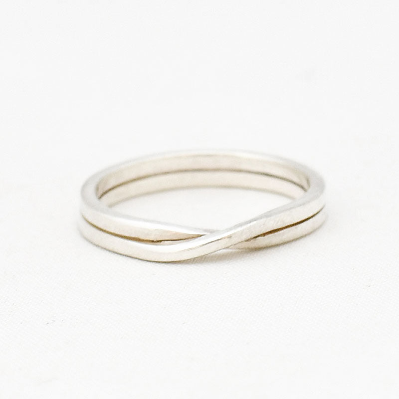 Zilver & Zoet sterling zilveren 925 dubbele ring met een twist in het midden. Deze ring is vernoemd naar de wiskundige August Ferdinand Möbius en staat bekend om zijn enkele, continue oppervlak zonder begin of einde. Deze ring bevat een dubbel doorlopende band, wat resulteert in een tijdloos symbool van oneindigheid; “Two shall become one”.