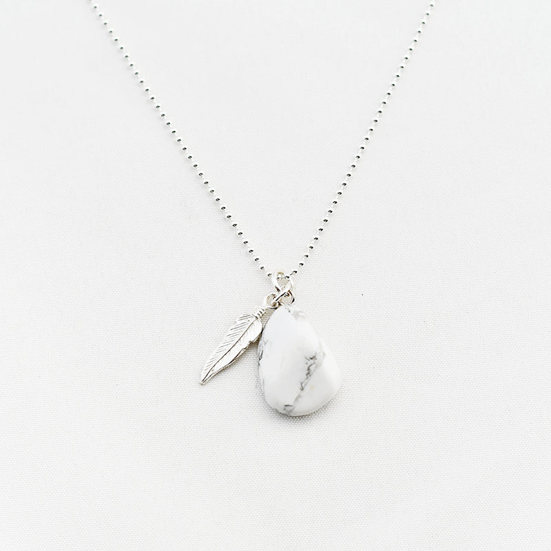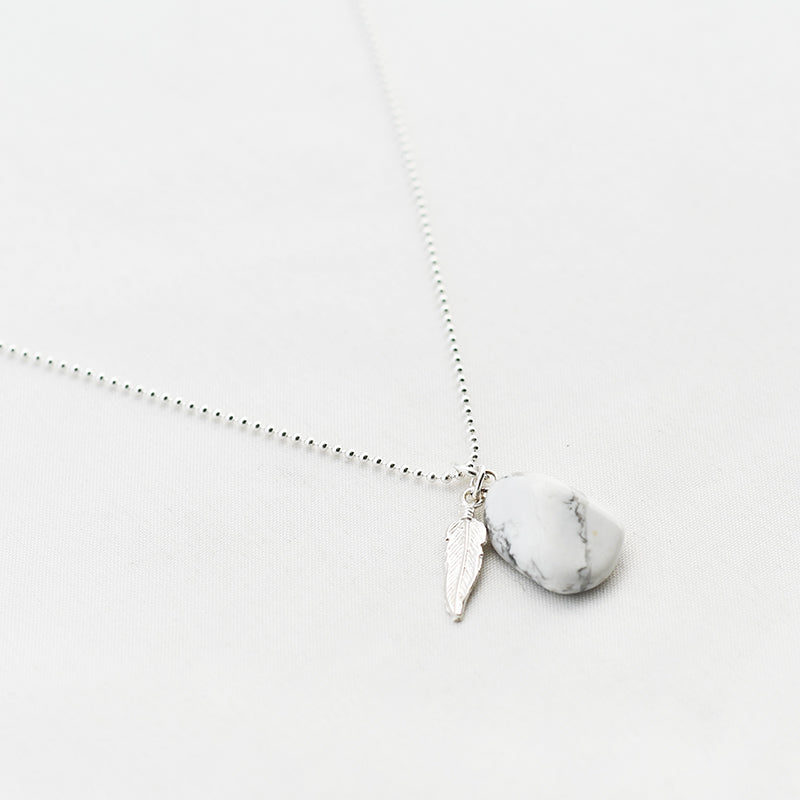 Zilver & Zoet ketting van sterling 925 zilver met een witte Howliet edelsteen bedel en een zilver veer bedeltje.