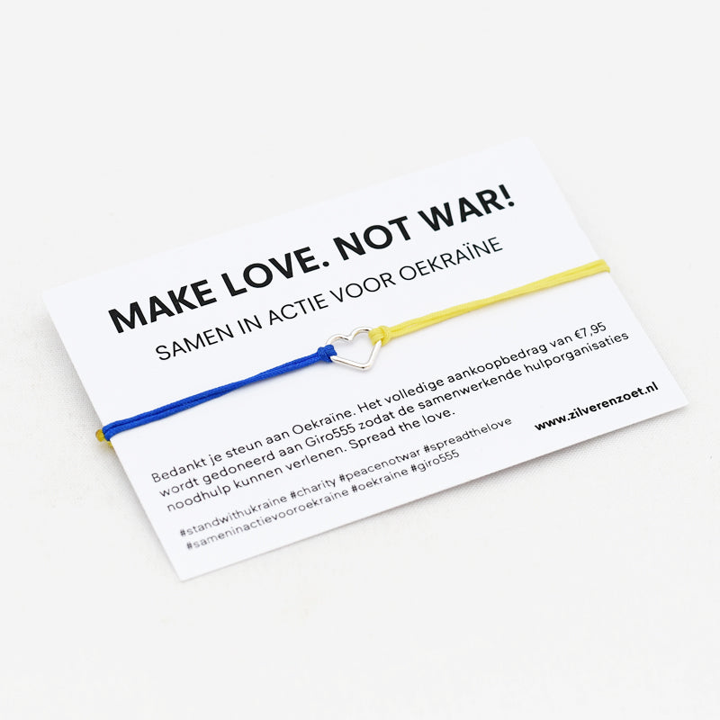 Om een kleine bijdrage te kunnen bieden hebben we dit armbandje met zilveren hartje ontwikkelt met een nylon bandje in de kleuren van de vlag van Oekraïne.