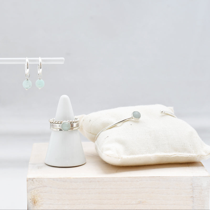 • Keuze uit edelstenen: amazoniet, amethist, aquamarijn (€10 extra,-), aventurijn, carneool, regenboog maansteen  (€10 extra,-), rozenkwarts, turquoise, onyx (zwart), toermalijn (groen), citrien, sodaliet, lapis lazuli, labradoriet, malachiet, tijgeroog.