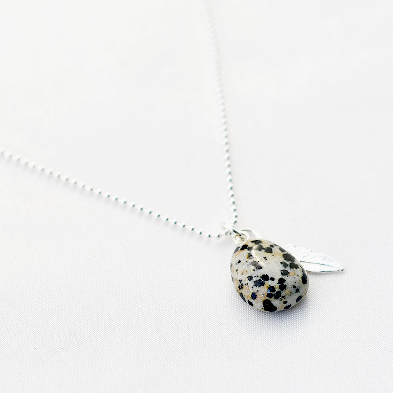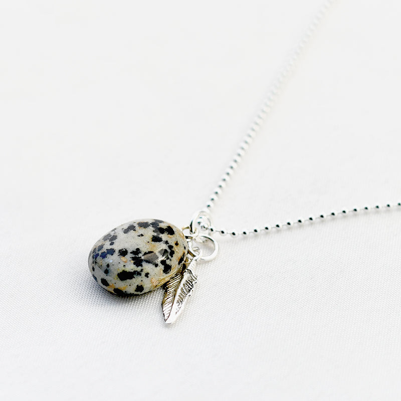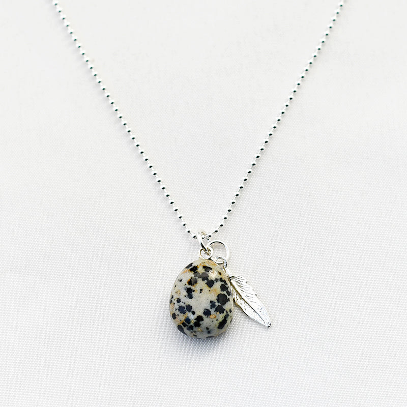Zilver & Zoet ketting van sterling 925 zilver met een dalmatiër jaspis edelsteen bedel en een zilver veer bedeltje.