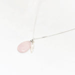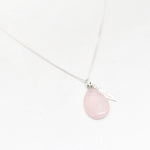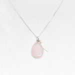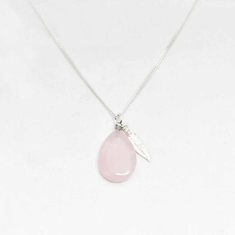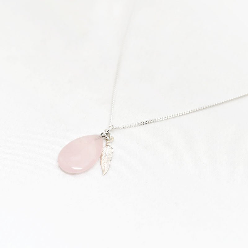 Zilver & Zoet ketting van sterling 925 zilver met een rozenkwarts edelsteen druppel bedel met een zilver veer bedeltje.