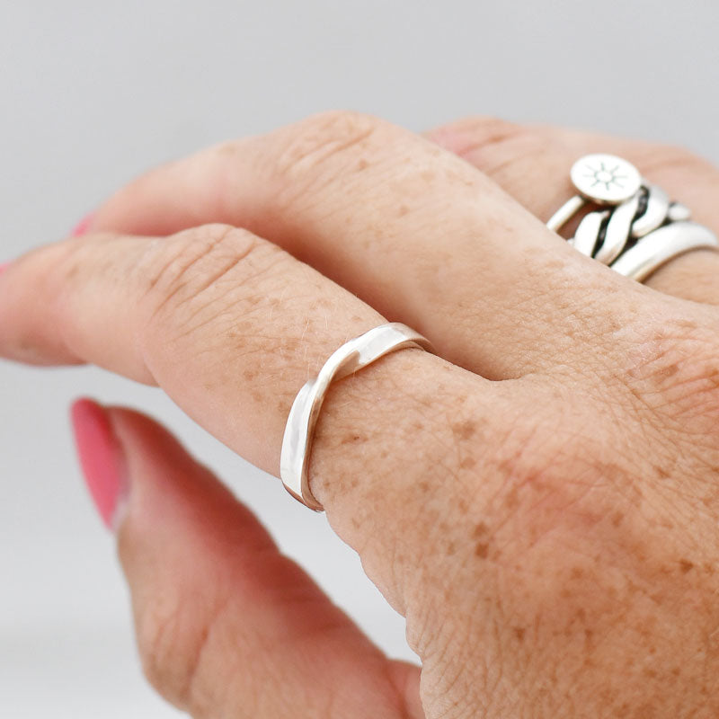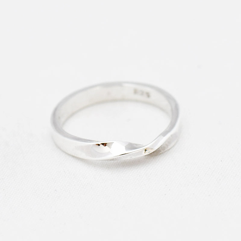 Zilver & Zoet sterling zilveren 925 platte ring met een twist in het midden. Deze ring is vernoemd naar de wiskundige August Ferdinand Möbius en staat bekend om zijn enkele, continue oppervlak zonder begin of einde. De knik vorm een elegante vorm, waardoor een tijdloos symbool van oneindigheid ontstaat.